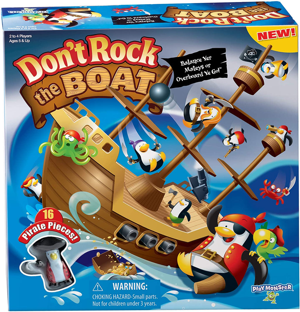 A 3D boat and 2-piece water wave are assembled, and 16 pirate penguins are divided according to the number of players. The object is to balance your pirate penguins on the boat without making it tip. Players take it in turns to place their penguins standing up on the boat, wherever they wish. As soon as the boat rocks and one or more penguins fall over the game, or round, ends. The last player before the player who rocked the boat is the winner.
