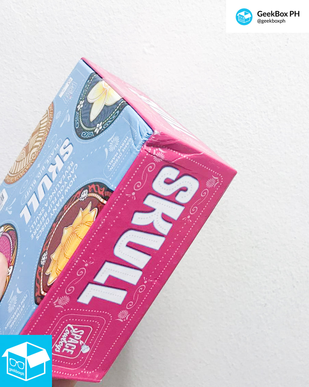 Skull & Roses is the quintessence of bluffing, a game in which everything is played in the players' heads. Each player plays a face-down card, then each player in turn adds one more card – until someone feels safe enough to state that he can turn a number of cards face up and get only roses. Other players can then overbid him, saying they can turn even more cards face up. The highest bidder must then turn that number of cards face up, starting with his own. If he shows only roses, he wins; if he reveals a skull, he loses, placing one of his cards out of play. Two successful challenges wins the game. Skull & Roses is not a game of luck; it's a game of poker face and meeting eyes.