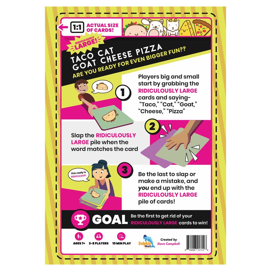 Dolphin Hat Games took the best-selling card game Taco Cat Goat Cheese Pizza and made it RIDICULOUSLY LARGE for even bigger fun!